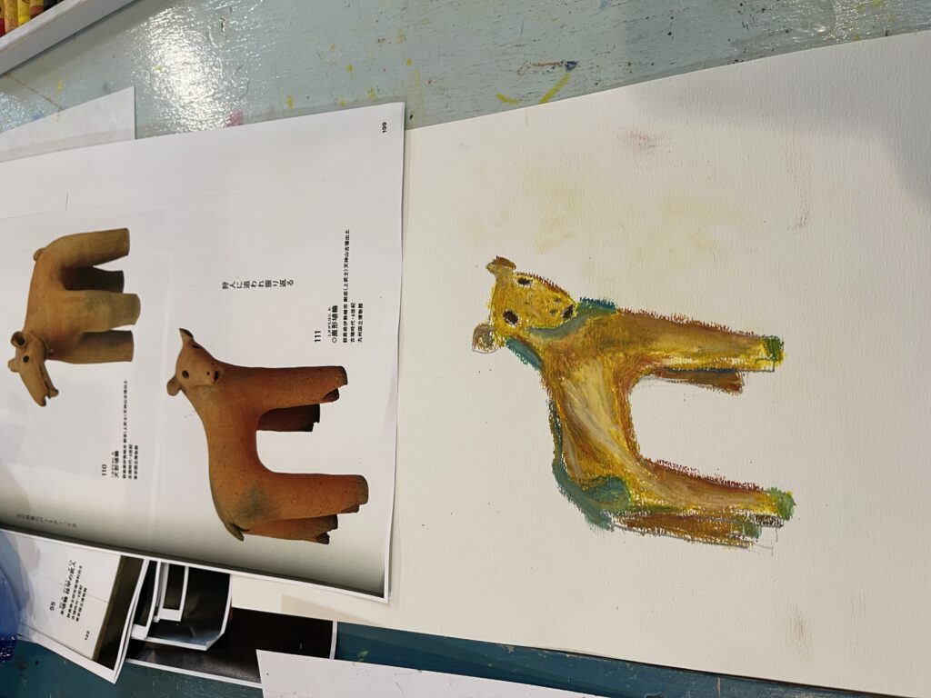 昨年(2024年)の後半は絵の練習を多めにしました。埴輪の絵は、昨年私が上野の「埴輪展」で買ってきた写真集を参考にして生徒たちに着彩の練習をしてもらいました。こっちを振り向いてる犬の埴輪の絵、かわいいですよね。こういう素朴な絵、大好きです。