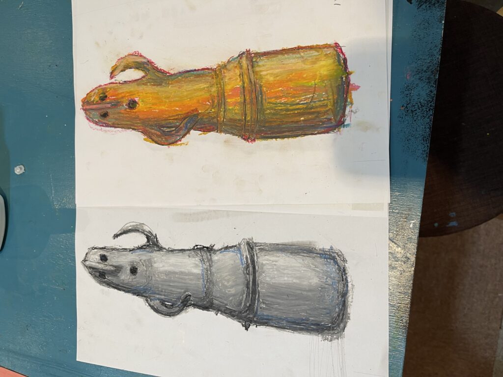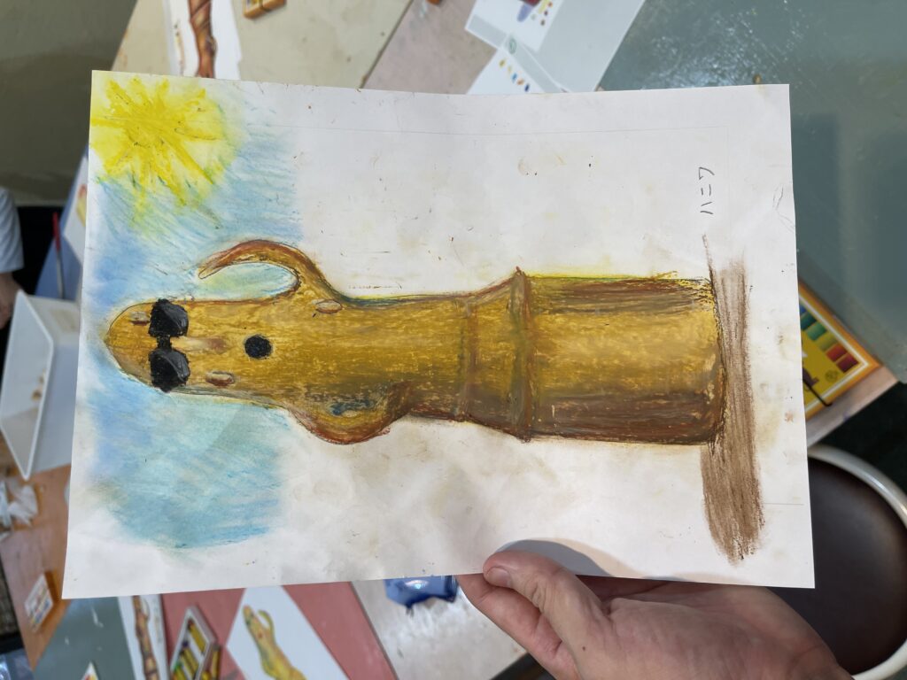 着彩の練習をしてたので、皆いろんな色で埴輪を描いていたのですが、一人モノクロで埴輪を描いてきた生徒がいまして、あまりにも上手過ぎて度肝を抜かれてしまいました。描いた当人は何ともない顔をしていたのですが、私は「え…うま…」と言葉を失ってました。時々うちの生徒たちは実力を発揮してくるので不意を突かれます。